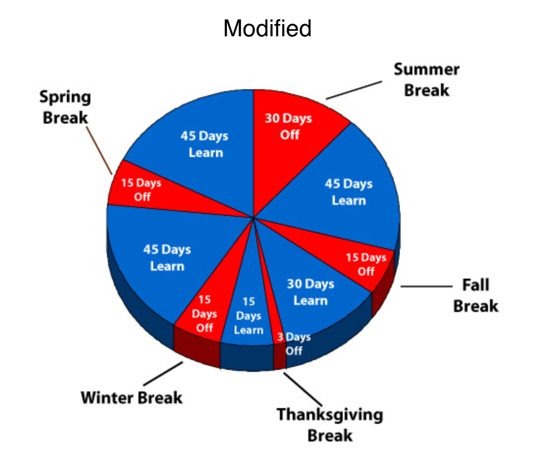 - Other districts move to a year-round schedule to alleviate overcrowding and avoid constructing new schools, using multiple “tracks” to cycle students in and out of buildings throughout the year.